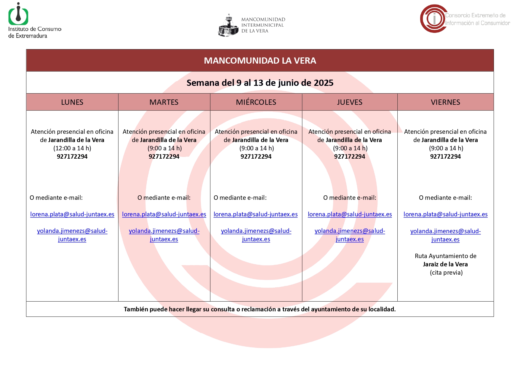 Planning de la semana del 9 al 13 de Junio de atención al público de la Oficina de Consumo 05 junio 2025